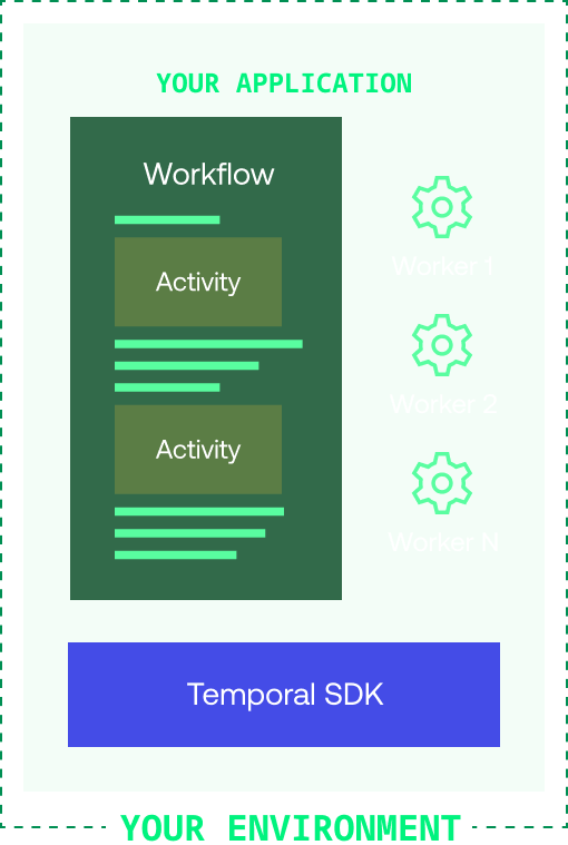 - A Worker, provided by the Temporal SDK, which runs your Workflow and Activities reliably and consistently.